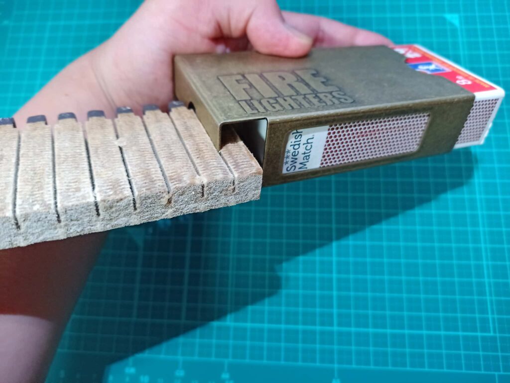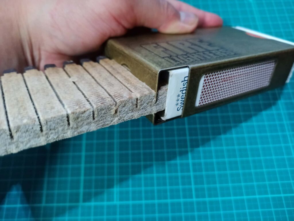 方法としては、まずロゴ側のスリットにファイヤーライターズのマッチを差し込みます。