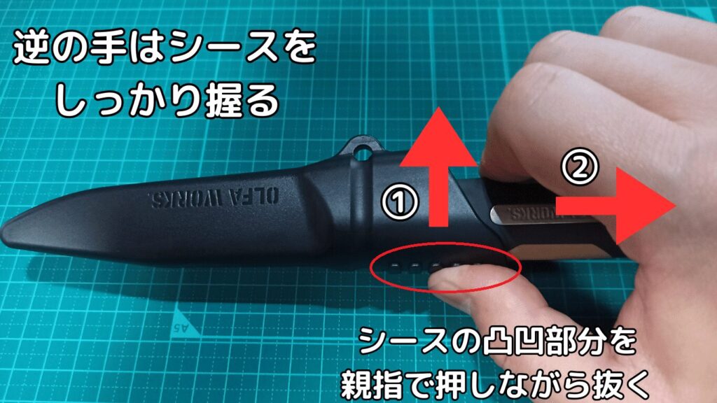 そこで、公式が紹介している方法を利用することで若干、抜きやすくなります。その方法が、シースの凸凹部を親指で押さえながらナイフを抜くというものです。