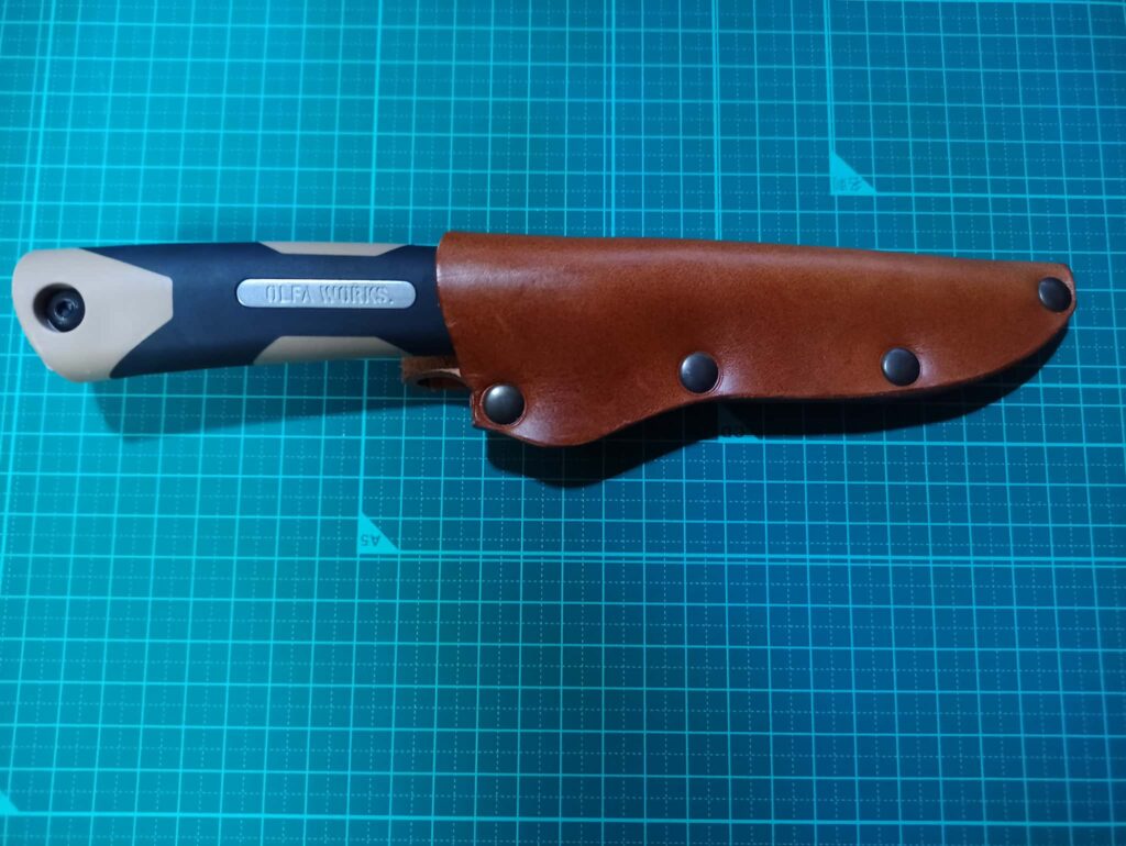 画像の革シースは、サンガ付属のシースよりも抜きやすいものです。シースからサンガが抜け落ちることもありません。さらに筆者の意見ですが、革シースに納めたサンガを見ると所有感が満たされます。