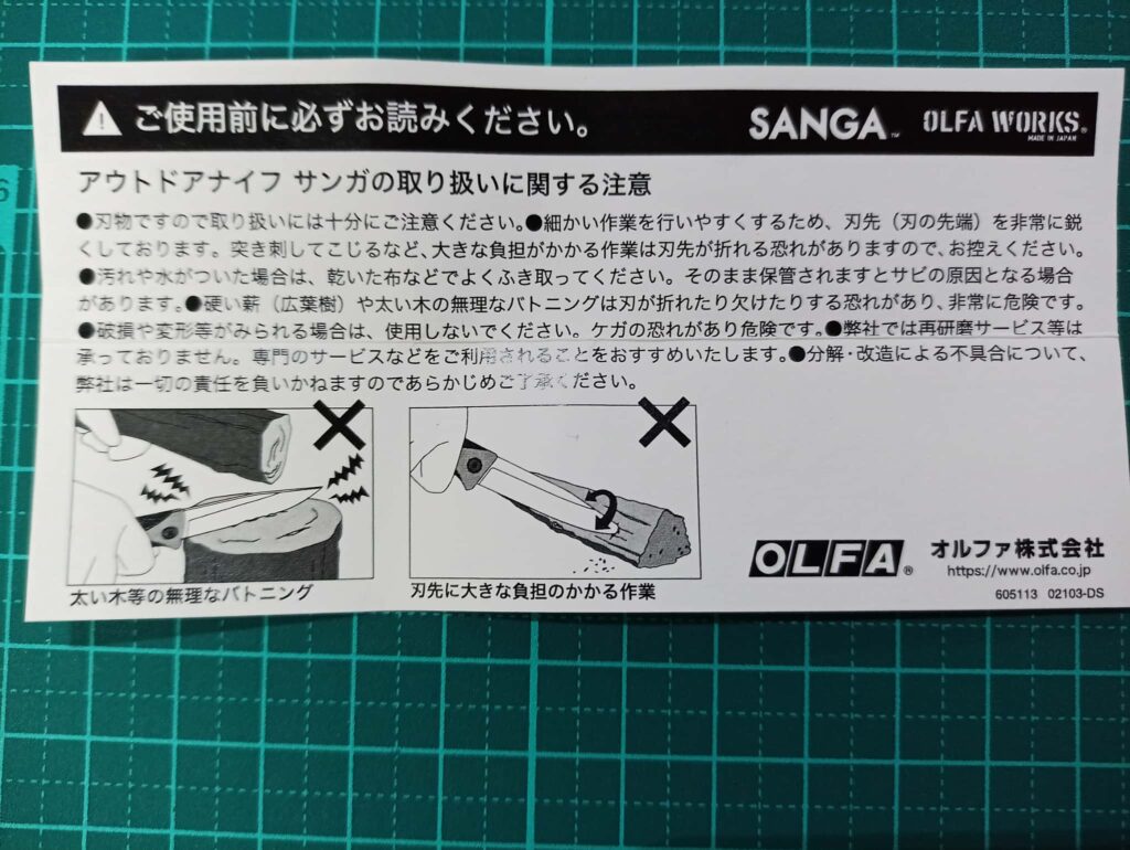 サンガは、オルファ株式会社のカッターナイフ作りの知識や経験を昇華させたアウトドアナイフとなります。